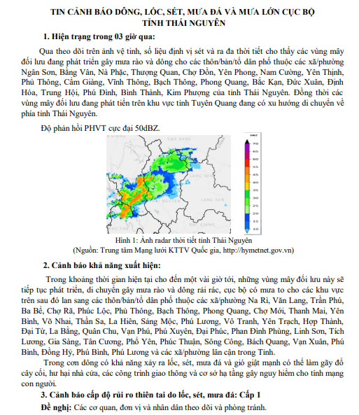 TIN CẢNH BÁO DÔNG, LỐC, SÉT, MƯA ĐÁ VÀ MƯA LỚN CỤC BỘ TỈNH THÁI NGUYÊN