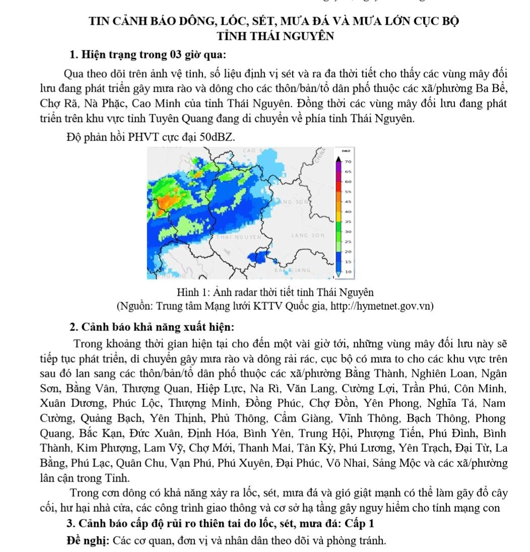 TIN CẢNH BÁO MƯA DÔNG, LỐC, SÉT, MƯA ĐÁ, VÀ MƯA LỚN CỤC BỘ TỈNH THÁI NGUYÊN
