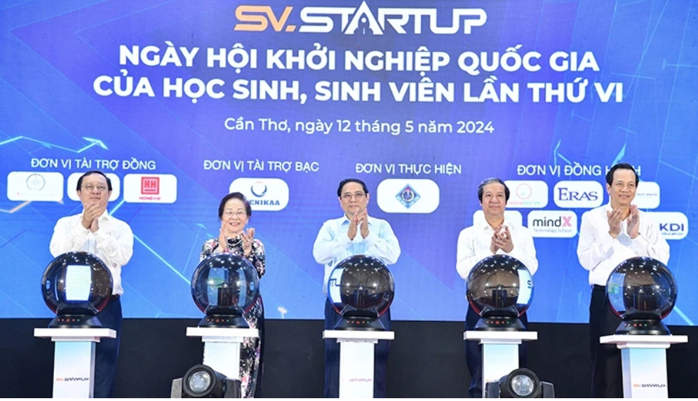 Thủ tướng Phạm Minh Chính và các đồng chí lãnh đạo thực hiện nghi thức khai mạc SV-Startup.