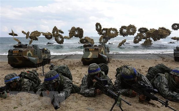 Binh sỹ Mỹ và Hàn Quốc tham gia cuộc tập trận đổ bộ chung ở Pohang, Hàn Quốc, ngày 2/4/2017. (Ảnh: AFP/ TTXVN)