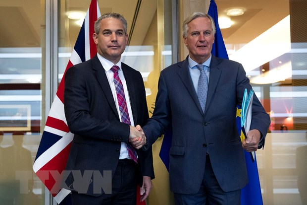Trưởng đoàn đàm phán Brexit của EU Michel Barnier (phải) và Bộ trưởng Brexit của Anh Stephen Barclay tại vòng đàm phán ở Brussels, Bỉ, ngày 11/10/2019. (Nguồn: AFP/TTXVN)