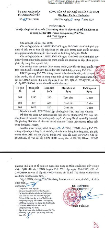 Về việc công khai hồ sơ mất Giấy chứng nhận đã cấp của bà Đỗ Thị Khoan có sử dụng đất tại TDP Thành Lập, phường Phổ Yên, tỉnh Thái Nguyên.