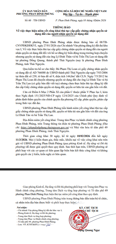THÔNG BÁO Công khai về việc làm thủ tục cấp Giấy chứng nhận quyền sử dụng đất, quyền sở hữu tài sản gắn liền với đất của ông Mông Đình Thắng